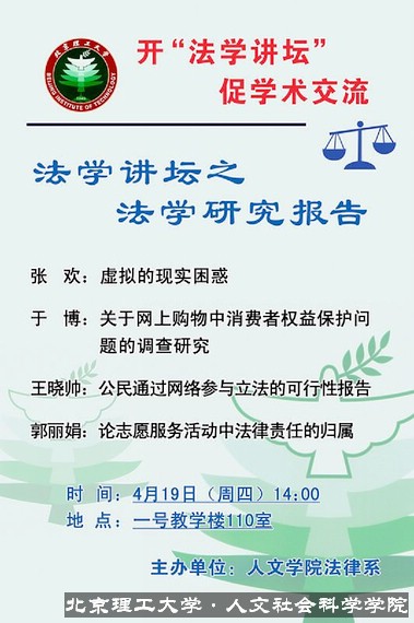 自4月19日始至5月24日,人文学院法学讲坛共分四坛,坛坛飘香呈现在师生面前。在这一系列活动中,上至学院副院长、副书记以及各位教授、导师,下至全体同学,齐心参与、各献其力,开创了人文学院新的学术氛围,为我校综合性大学人文素养的培育作出了力所能及的努力。