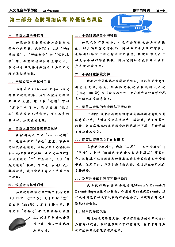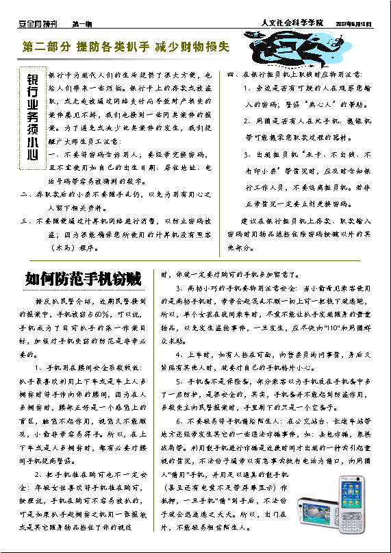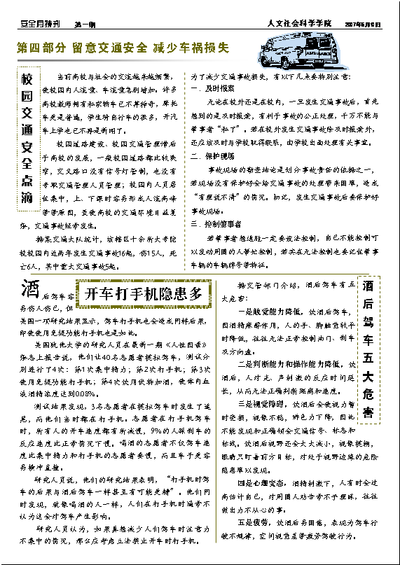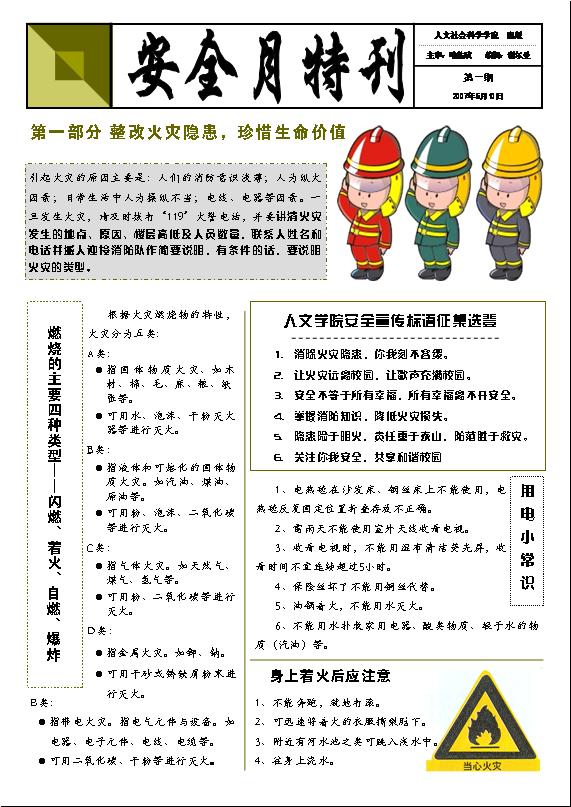 为了进一步做好全国安全生产月宣传工作,让安全的理念深入人心,人文学院制作、引发了《安全月特刊》,内容包括人文学院安全标语征集选登以及防火防盗、交通信息等方面的安全知识。(点击下面小图,可查看大图)