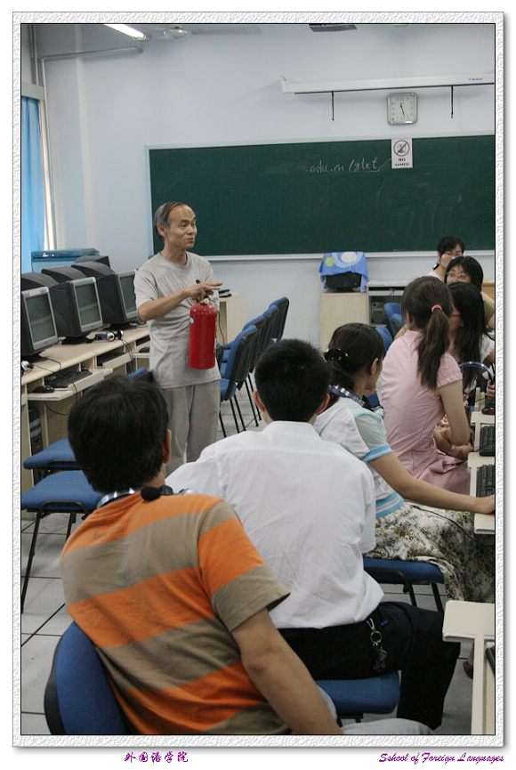 为贯彻学校安全生产月活动的方案,加强安全保障工作,消除安全隐患,外国语学院党委书记王文清老师带领行政副院长林彤老师及其他相关老师对学院的各教研室、实验室、网络视听室等进行了安全检查。