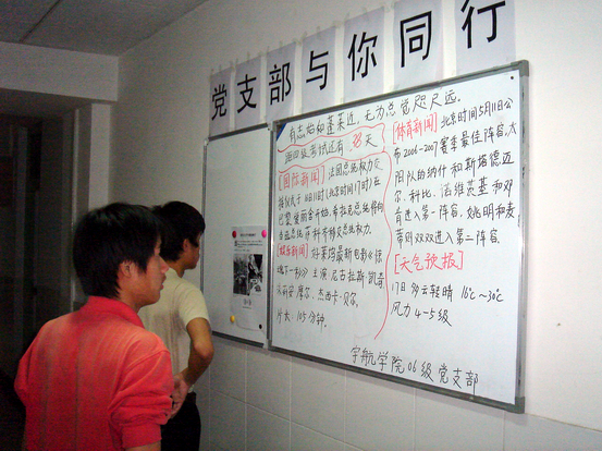 为了使同学们能及时准确地了解国内外新闻,把握国内外形势,了解院校开展的各种活动,及时得到院校的通知,党支部在11号和16号宿舍楼共挂了3 块宣传板,由党支部成员和入党积极分子轮流每天更新宣传板的内容,为同学们提供了一个获取信息的便捷平台。