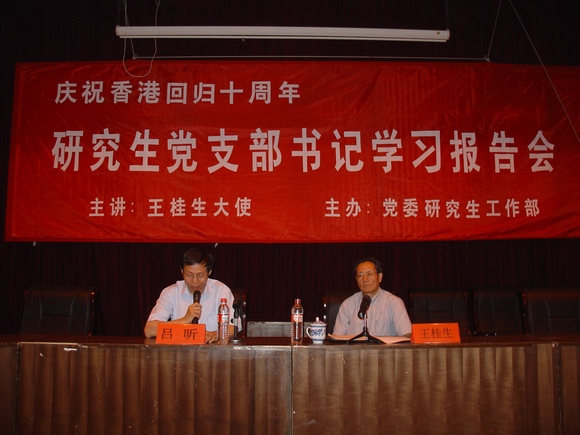 为庆祝七一建党86周年与香港回归10周年,党委研究生工作部邀请原外交部港澳事务办公室主任、中英联合联络小组中方首席代表王桂生大使来我校作《中英关于香港问题的谈判》的报告。6月27日晚,在七号教学楼报告厅王大使的报告会如期举行。出席报告会的有研究生院常务副院长吕昕老师、党委研究生工作部部长肖文英老师、副部长魏名山老师,全校研究生党支部书记以及对香港历史与发展感兴趣的同学。