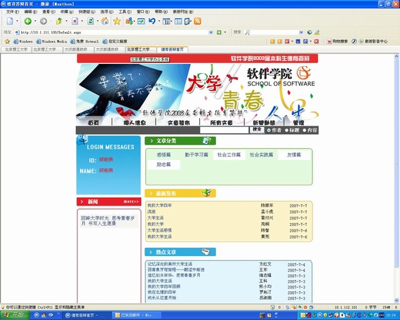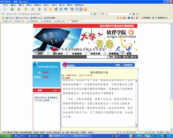 为了更好的将德育答辩的效果辐射到大学的四个年级,软件学院不但安排了低年级学生参与德育答辩会,还发挥专业优势建立了“大学、青春、人生”德育论文网站。所有的毕业生将德育论文上传至网站上,供学弟学妹查阅,为他们提供好的经验和建议。