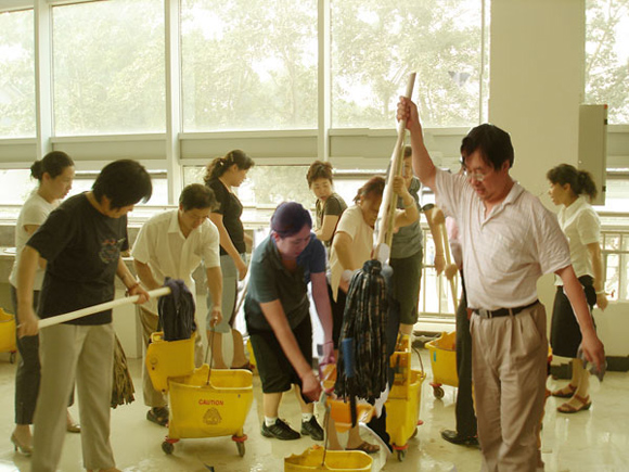 2007年7月5日下午四点,后勤集团党委组织集团全体党员和入党积极分子,开展“党群零距离”系列活动之一——义务劳动。本次劳动分两个“战场”,一个是清理家属区环境,一个是清扫新食堂卫生。为搞好此次活动,集团党委从劳动任务的分工,到劳动工具、饮水、宣传等方面工作都做了充分的准备。集团所属党政领导以普通党员的身份和150余名党员和积极分子一起,冒着酷暑,积极参加了此次党日活动。