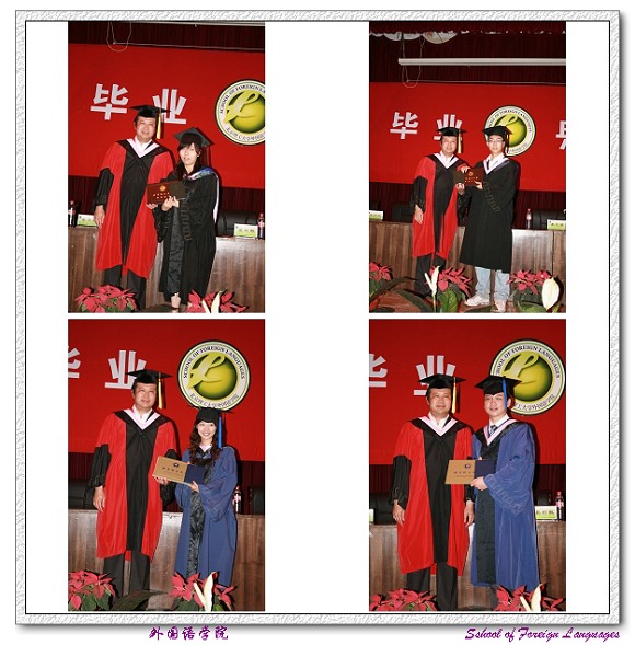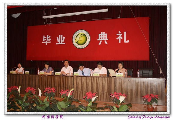 2007年7月9日下午,外国语学院2007届毕业生毕业典礼在7号楼报告厅隆重举行。外国语学院院长吴树敬老师,党委书记王文清老师,副书记、副院长吴文君老师,副院长李京廉老师,副院长谭利群老师,副院长林彤老师及教师代表姜爱红老师、学科带头人陈大明老师出席了此次毕业典礼。外国语学院2007届全体本科毕业生、研究生毕业生及部分学生家长参加了毕业典礼。