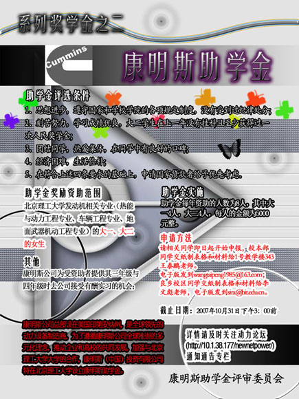 今年10月份,康明斯(中国)投资有限公司为了推动企业和高校的共同发展,加强与我校的合作,特在我校设立康明斯助学金。助学金奖励资助金年会jinnianhuicom发动机相关专业(热能与动力工程专业、车辆工程专业、地面武器机动工程专业)的大一、大二的女生,要求思想进步、学习成绩优良、团结同学、生活俭朴,在此基础上,经济困难、申请国家贷款者给予优先考虑。助学金每年资助的人数为8人,其中大一4人,大二4人,每人的金额为5000元整,要求受助者当年不得与其他助学性质的奖助学金兼得。