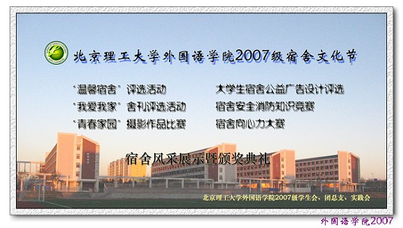 为加强学生宿舍思想道德建设和学风建设,丰富校园文化生活,创造美好的生活空间,培养学生良好的生活习惯,倡导宿舍文明,激发学生的集体荣誉感,决定在学院2007级举办外国语学院宿舍文化节。