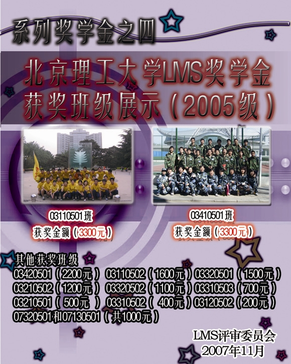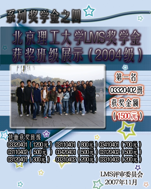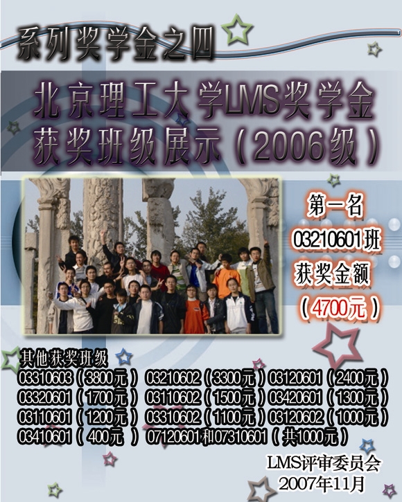 LMS奖学金是比利时LMS国际公司于2004年在我校设立的班级奖学金,主要奖励我校团结勤奋、学风优良、成绩优秀、积极进取、奋发向上、具有团结协作精神的本科班集体。此前已有90多个本科班级获得此项奖学金。