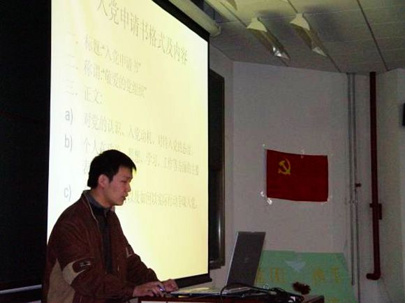 接着,由支部宣传委员耿金越同学细致地讲解了入党的相关知识及流程,并着重向大家强调了如何端正入党动机、入党申请书的写法、在我校入党的基本要求等大家特别关心的问题。通过这次讲解,同学们全面而细致地了解了整个入党程序,进一步明确了今后自己的努力方向。