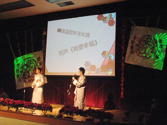 本科06级的表现则更加突出:让人捧腹的相声《我要幸福》,把大家从繁忙的课业中解脱出来,轻松、愉悦的享受生活、体味幸福;