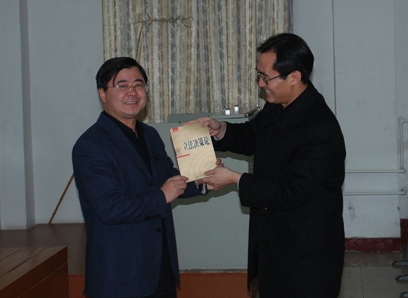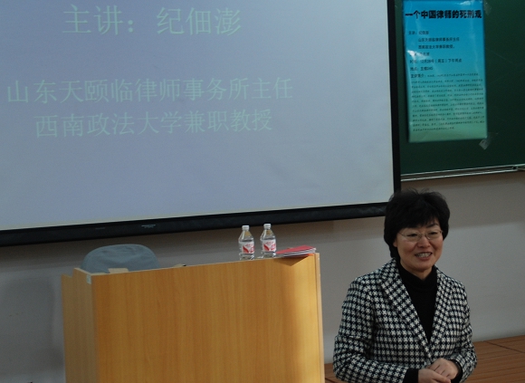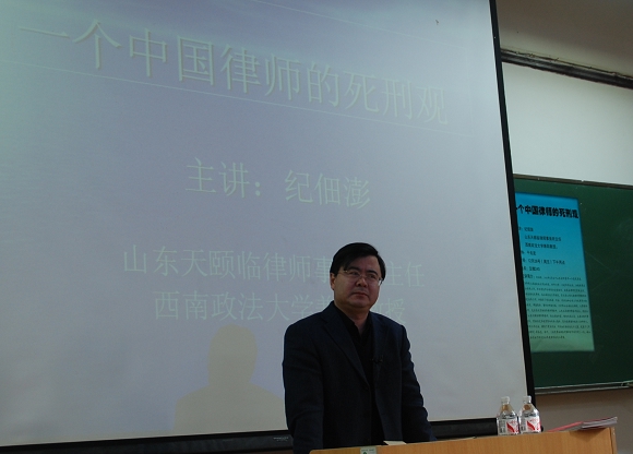 12月28日下午两点,人文学院2005级法学专业同学以及部分法学系研究生齐聚主楼240教室,认真聆听了来自山东天熙临律师事务所主任律师,西南政法大学刑法学兼职教授—纪佃澎老师,关于“一个中国律师的死刑观”的学术讲座;人文学院法学系张艳丽老师,于兆波老师,陈君老师以及李金明老师出席了本次活动。