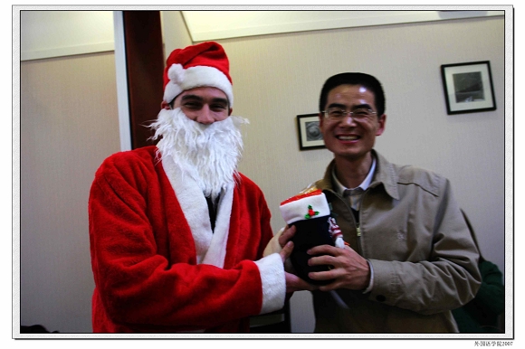 李京廉副院长高兴地接受外籍教师装扮的“圣诞老人”的礼物