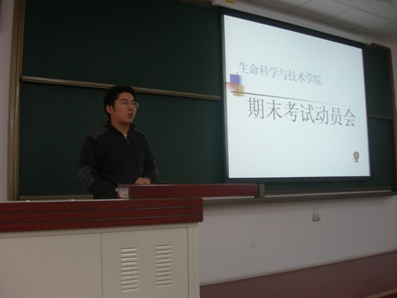 2008年1月9日,生命科学与技术学院在良乡分校区举行2007级期末考试动员大会,针对即将到来的期末考试,结合上级相关精神,对07新生开展考试动员工作,生命学院罗爱芹副院长,分团委书记王征老师参加大会。分团委副书记、2007级辅导员郭惠芝老师主持了本次大会。