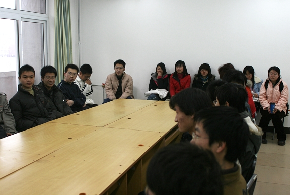 为加强两校区间的延伸管理机制、落实学校关于《开展学校领导及中层干部联系2007级学生班级工作的通知》。2007年1月15日下午,信息科学技术学院领导前往良乡进行班级座谈。信息学院党委书记薛唯、副书记副院长郝群、良乡校区学生办公室副主任丛磊、以及01410701班全体同学参加了座谈。