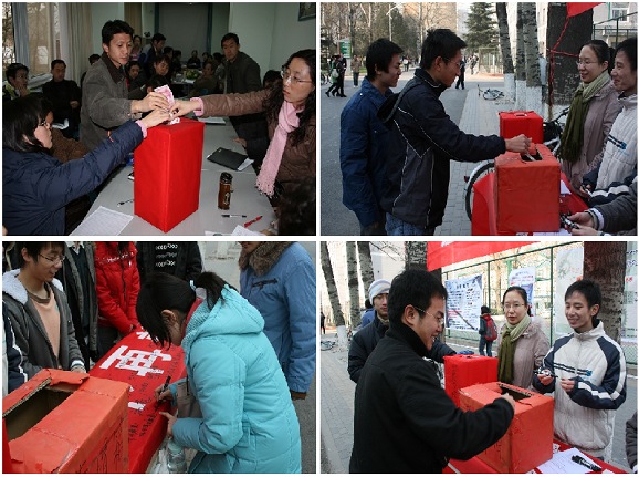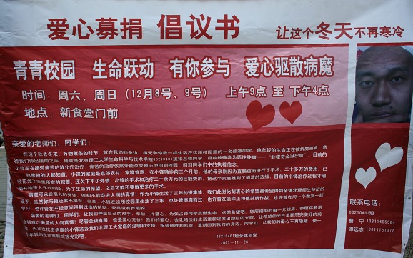 对于这个情况,生命学院领导非常重视,首先在学院范围内发起倡议,开展了爱心捐款的活动,并多次前去医院探望治疗中的张占锋同学,为他以及他的家人送去一份温暖。同时,张占锋同学所在的06210401班联合学院青年志愿者协会向全校发出倡议书,并于2007年12月8日、12月9日和12月13日,分别在中关村校区与良乡校区举行了现场募捐的活动,募捐现场气氛温馨而感人,同学们不畏寒冷坚持捐款活动的进行,而路过的人们纷纷决囊相助,并在留言册上写下对张占锋的祝福。经过学院捐款、以及现场募捐,最后总共收到捐赠款项计54271.32元。