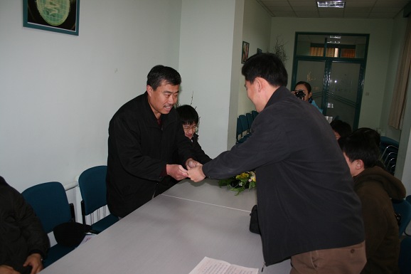 2008年1月17日上午,不幸身患恶性淋巴肿瘤的生命学院06210401班张占峰同学的父亲从生命学院副书记、副院长周连景老师的手里接过了存有来自学院和学校校师生共计五万余元爱心捐款的存折。