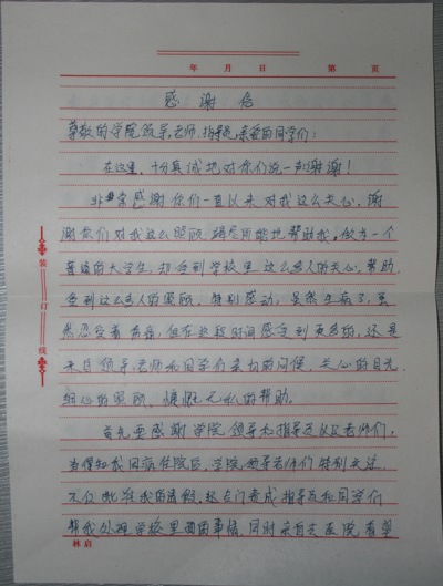 首先要感谢学院领导和辅导员以及老师们,当得知我因病住院后,学院领导老师们特别关注,不仅批准我的请假,还专门责成辅导员老师和同学们帮我处理学校里的事情,同时亲自去医院看望我,并亲切与我交谈,稳定我因病而沮丧的情绪,十分关心我的病情。一想到领导老师们在工作十分繁忙的情况下也腾出时间来关注我的事情,我就觉得特别过意不去。辅导员老师特别负责任,从一开始就帮助我与学院领导部门沟通,帮我处理诸如请假,报销等事情,使我可以安心养病,他们从不因为自己忙而耽误了我的事情。我很高兴能有这么好的领导和导员。