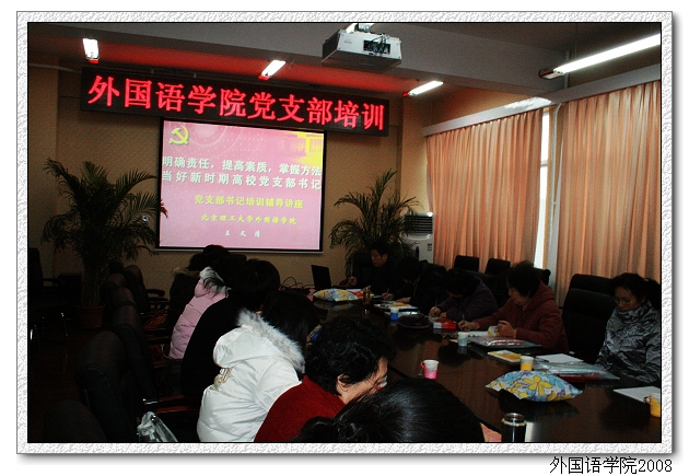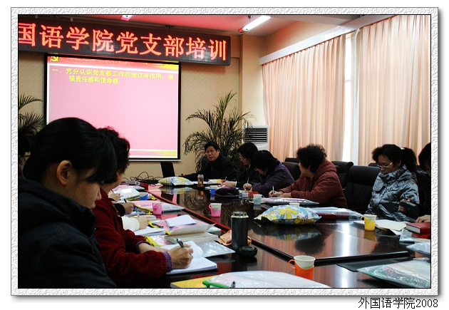 2008年1月22日上午,外国语学院在中心教学楼515会议室进行党支部书记培训讲座。主讲人为外国语学院分党委书记王文清同志,副书记、副院长吴文君及学院教工党支部书记和学生党支部书记参加了辅导讲座。