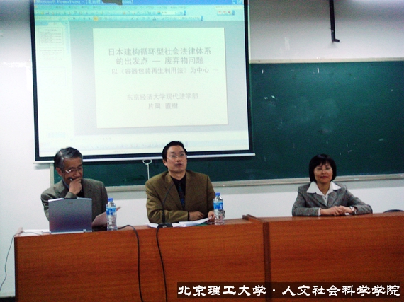 3月5日晚,来自日本的片冈直树教授在1号楼110教室为大家带来了一场题为“日本建构循环型社会法律体系的出发点:废弃物问题”的学术报告。人文学院法律系副主任杨成铭教授、罗丽副教授以及出席了报告会。本次报告会也是人文学院法律系“著名法学家讲坛”系列活动的一部分。杨成铭教授(中)主持 介绍片冈直树教授(左)情况
