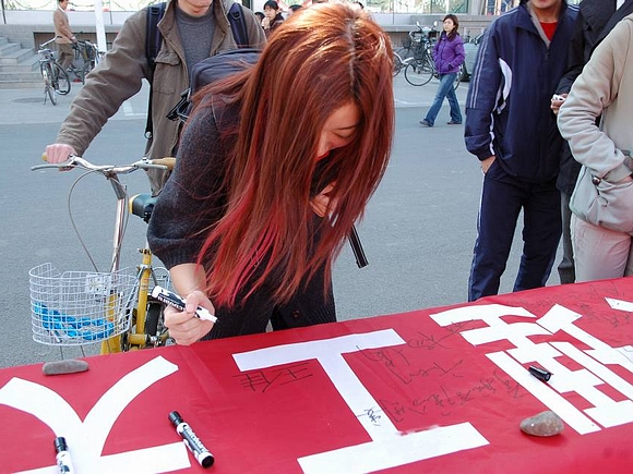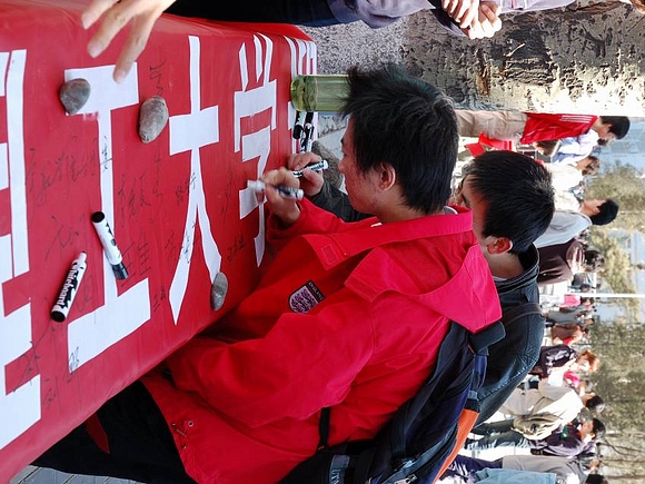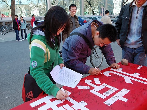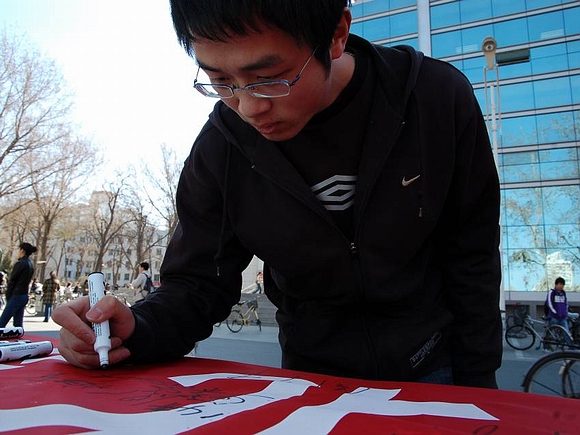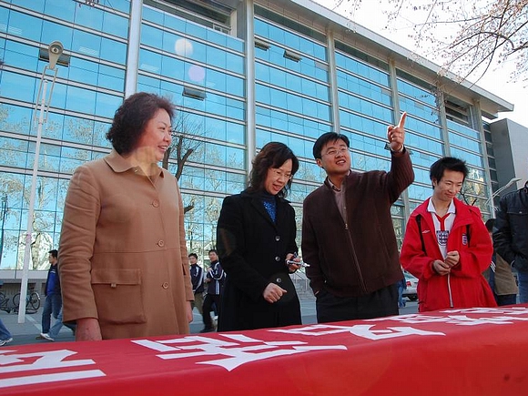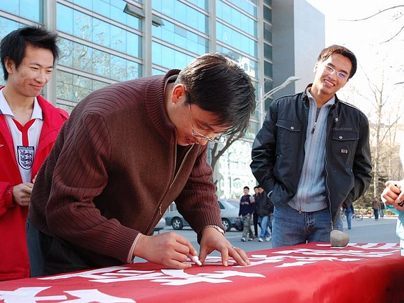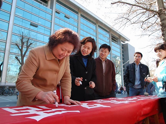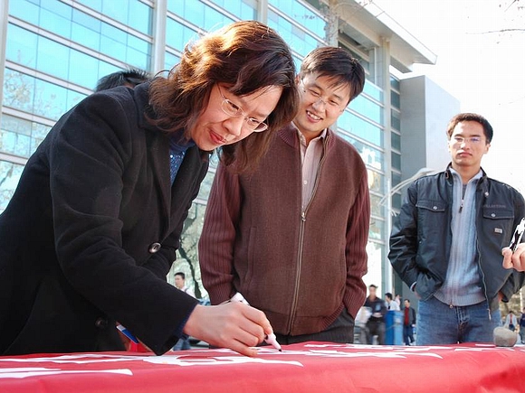 此次活动还得到了全校师生,尤其是广大党员的广泛支持,大家纷纷在条幅上签下自己的名字或所属党组织的名称,充分表达了对奥运的企盼和为奥运服务的承诺。