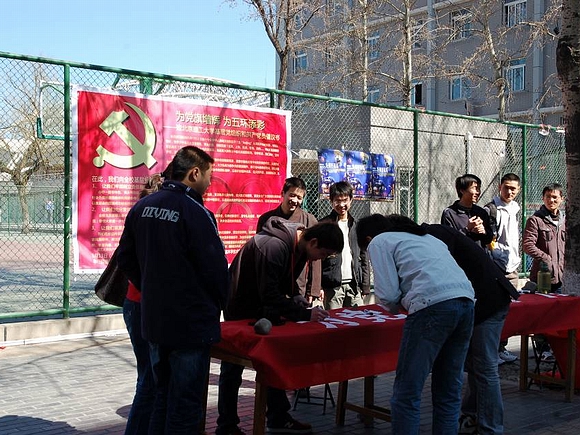 宇航科学技术学院本科生2005级党支部全体党员在向全校党员和基层党组织发出《为党旗增辉 为五环添彩——致金年会jinnianhuicom基层党组织和共产党员倡议书》后,于3月13日、14日在新食堂对面举行了“为党旗增辉 为五环添彩”迎奥运主题签名活动,得到全校师生的广泛支持。