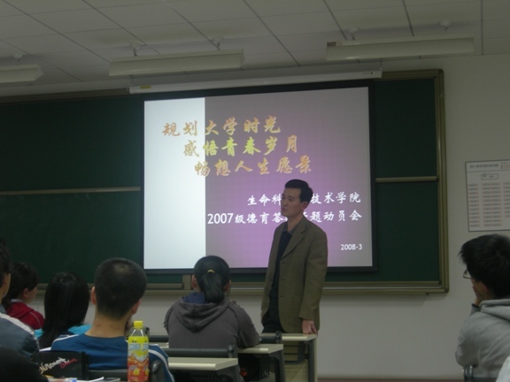 2008年3月14日晚7点,生命科学与技术学院于良乡理科教学楼1-105室召开大一新生德育开题报告动员会。会议由07级辅导员郭惠芝老师主持,生命学院党委副书记、副院长周连景老师出席了大会。