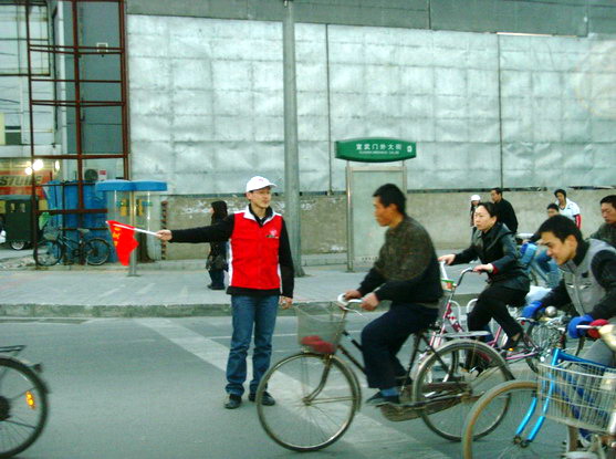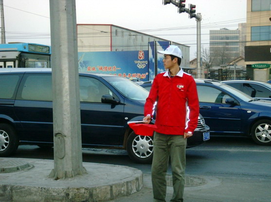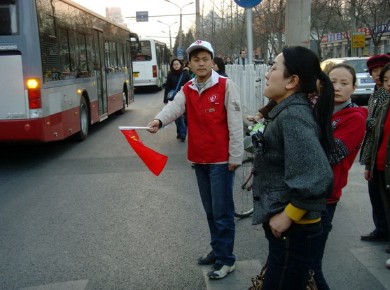 早上7:30,党支部成员身着北京社会志愿者工作服,手持交通协管旗帜,在交警和交通协管员的安排下开始了工作。