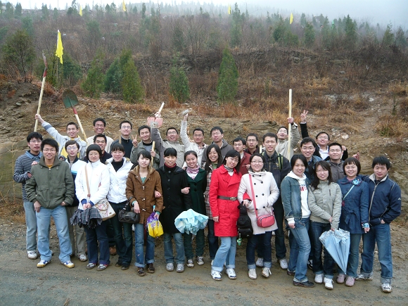 当天上午9:00全体成员顺利到达目的地,并在中门寺生态园区外合影留念。这次活动是机械与车辆工程学院研究生为庆祝奥运圣火点燃所举行的系列活动之一,又时值全国义务植树27周年,更是激发了同学们植树的积极性。