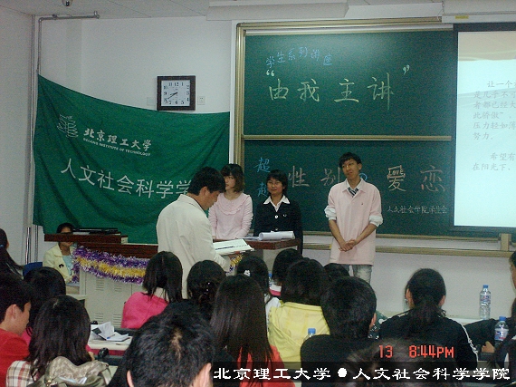 2008年4月13日07级人文学院学习部“由我主讲”学生系列讲座在良乡理科教学楼108隆重拉开了帷幕。此系列讲座是完全由学生主办学生主讲的活动,内容丰富形式新颖,为同学们提供交流学习和展示自己的平台。