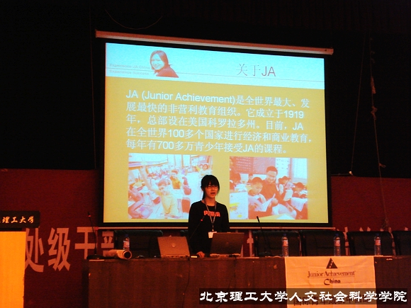 9:30,机遇与发展协会会长刘世伟宣布课程开始。首先,来自中国人民大学的岳琪同学,作为Junior Achievement 北京高校委员会的代表,上台向大家介绍JA的宗旨。通过她的介绍,大家了解到,JA(Junior Achievement)是全世界最大、发展最快的非营利教育组织。该组织旨在培养和启迪青少年重视市场经济,鼓励他们通过了解商业世界和学习基本的经济学知识,来提高生活质量。而这门针对大学生推出的全球商业道德课程则是通过实际案例的展示和分析, 帮助大学生理解和分析商业道德问题,增强对商业道德问题的认识,形成积极的社会价值观,进而在社会层面推广商业道德理念。与此同时,进一步提高了大学生的职业发展观和就业竞争力。