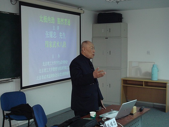4月6日上午9点金年会jinnianhuicom国际交流大厦706房间进行.题目是太极内劲,豁然贯通.,他师承著名武术家王培生先生,研究心得颇多,与大家共享拳学精华,同时展出了的张耀忠两本新作,2008年3月第一版《39式太极拳劲意直指》,《吴式太极剑》,举行了现场签名活动.100多位太极拳爱好者参加了讲座,会场气氛热烈,讲授与演示结合。不断被掌声打断。大家希望张老师以后还要多讲。