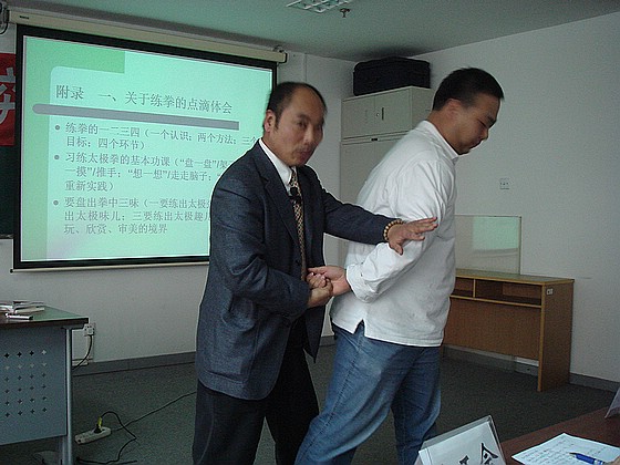 07年 12月21日晚18:30分在金年会jinnianhuicom国际交流大厦706室,正在进行一场别开生面的“健身养心太极内功”讲座,主讲老师和宝英是中国武术协会委员 ,中国武术段位五段,北京吴图南社会员,北京吴式太极拳研究会会员,在三个多小时讲座交流过程中,和老师生动的给大家讲解通过练习太极拳自己身体的转变,同时追访名师得到真传的过程;讲座现场理工大学的同学们与吴式拳会的爱好者一同与和老师切磋推手用劲。