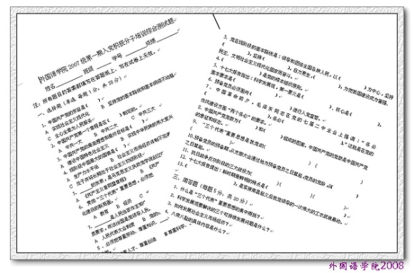 外国语学院2007级共有学生90余名,其中递交入党申请书的同学占学生总人数的一半,入党积极分子40余名。本次考试安排在学校太极操比赛之后,同学们都准时地来到教室,认真地参加考试,显示出积极分子追求进步、努力提高的决心。
