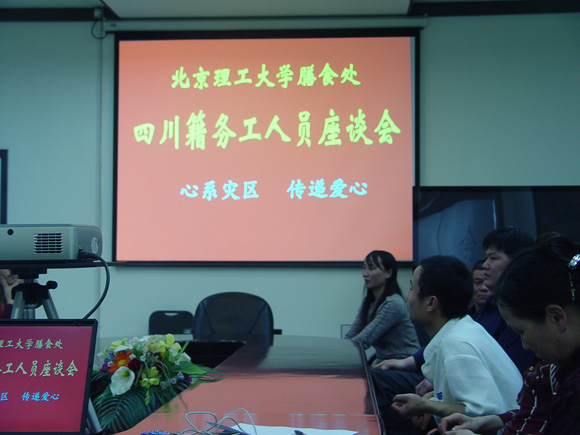 5月12日四川汶川发生了7.8级大地震,消息传到北京后,在膳食处打工的川籍务工人员心里都惦记着家里的安全。14日下午,膳食处及时召开了川籍务工人员座谈会,有16位务工人员参加座谈会。张书信处长首先关切地询问了每一个务工人员是否都和家里联系上了?家人是否都平安?川籍务工人员一个一个地介绍了他们和家里联系的情况,当得知他们的家属都没有发生伤亡事故后,膳食处的领导们都松了一口气。张书信处长说:四川发生地震,全国人民都非常关心,你们的家乡受灾了,我们也十分牵挂。党中央、国务院已经全面部署抗震救灾工作,一方有难,八方支援,我们相信全国人民万众一心,众志成城,一定会夺取抗震救灾斗争的胜利。张书信处长安慰并鼓励大家,安心工作,稳定情绪,膳食处是务工人员的家,对有困难的员工我们会给以帮助的。参加会的务工人员很多人眼里含着泪水,对膳食处领导的关心表示感谢。