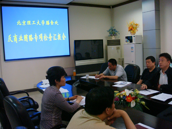 根据后勤集团党委的统一安排,2008年5月22日膳食处召开了反商业贿赂专项检查汇报会,出席会议的有后勤集团党委书记巫后新、膳食处处长张书信、副处长张小云、膳食处各中心主任、各食堂经理及采购、库房等部门的负责人。