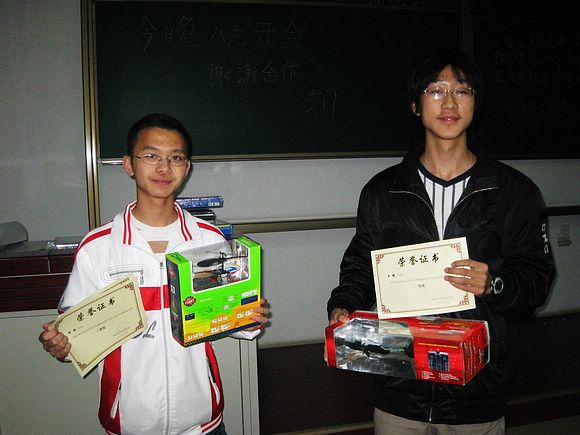 在阶段总结会上,“工作室”的学长为本次比赛获得优异成绩的同学颁发奖品,07级王超同学获得第一名。