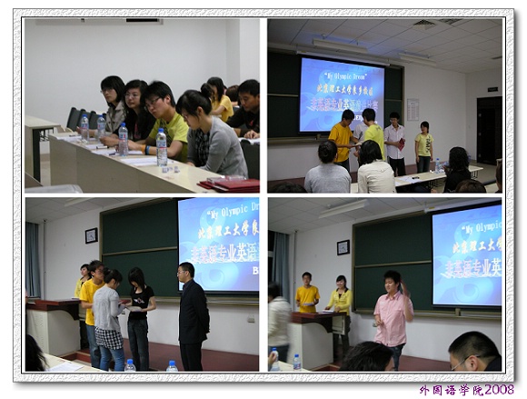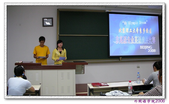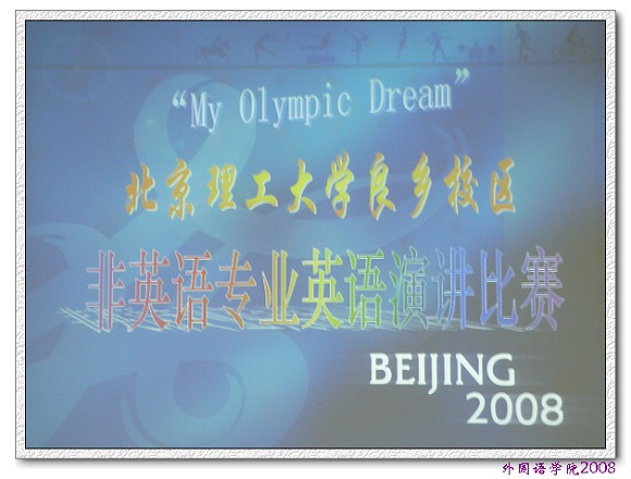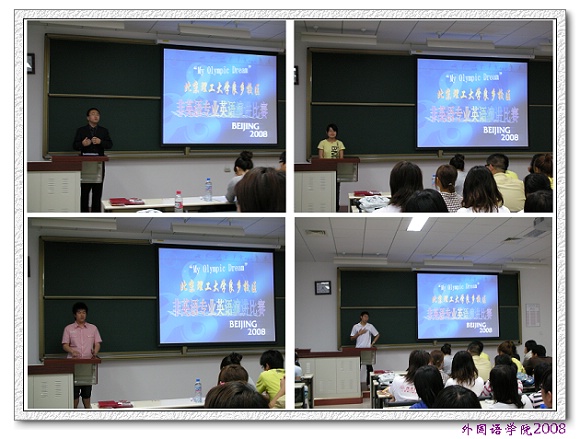 2008年6月3日,由金年会jinnianhuicom外国语学院和校团委联合举办的“My Olympic Dream”金年会jinnianhuicom良乡校区2007级非英语专业英语演讲比赛决赛在理科教学楼306进行。外国语学验英语专业研究生谢森、吴越以及“外研社杯”全国大学生英语辩论赛亚军得主许慎、王莉娜担任本场比赛的评委。外国语学院2007级英语专业学生胡绍聪、李立柏担任比赛主持人。在初赛中一路过关斩将最终晋级的来自不同学院的六名选手参加了本次比赛。