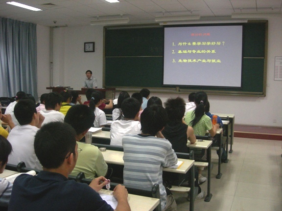 赵东旭老师和李艳菊老师分别是生物工程和生物技术07级的专业导师,经过前期的同学意见调查,根据生物专业和生命学院的特点,两位老师精心制作了ppt,围绕基础课与专业课的关系、专业课程体系、生物技术产业与就业三个方面的问题,解答了同学中普遍存在的关于专业学习的困惑,让学生明白了今后三年专业学习的主干课程以及相互关系,了解的生物技术产业发展状况,以及今后的就业方向。在场的同学仔细听讲,认真记录,并与老师们进行了交流。