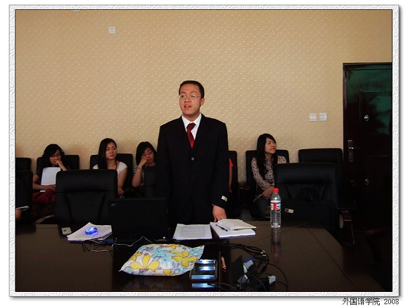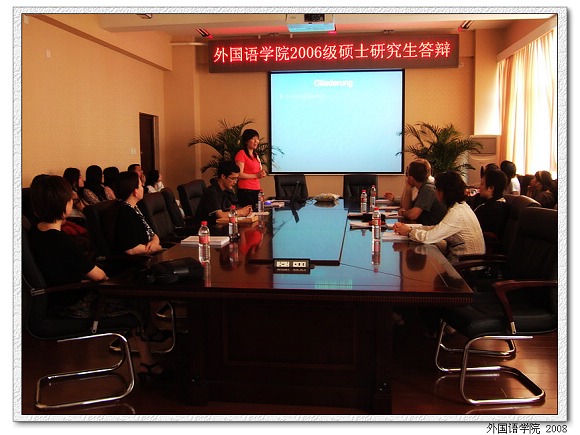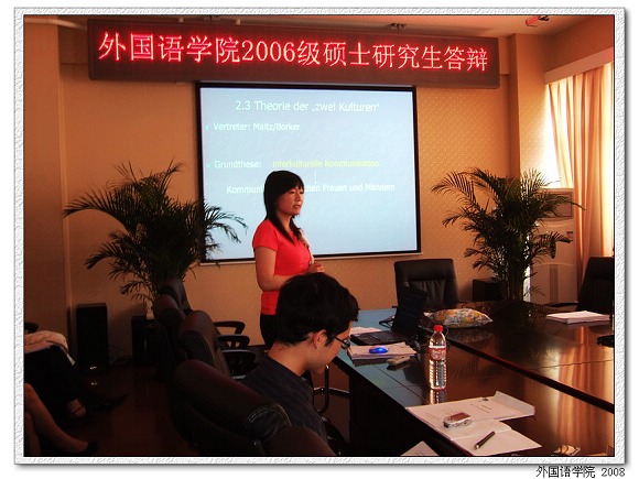 2008年6月6日下午2点,外国语学院德语系首届硕士研究生毕业论文答辩拉开了帷幕,打响了2008年外国语学院硕士研究生答辩的第一炮。经过两年的刻苦研读,学生们终于可以将自己的钻研成果展示给老师和同学,心情既紧张又激动。