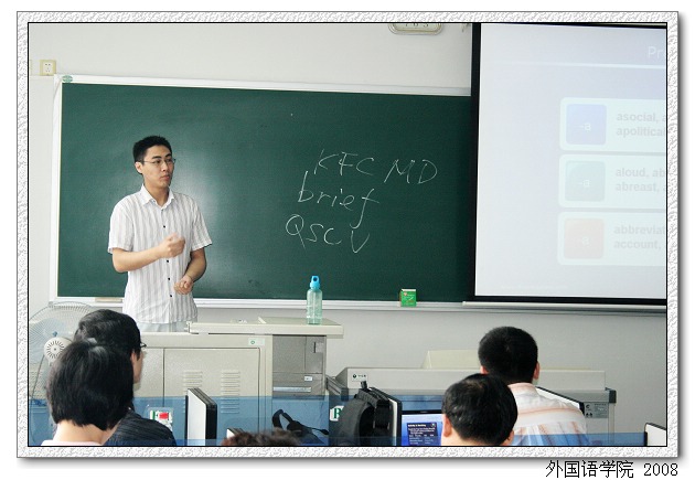 2008年6月30日上午,在中心教学楼524教室举办了“外国语学院首届青年教师教学基本功比赛”。参赛人员系我院40周岁以下在职任课教师。评委由外国语学院院长吴树敬、院党委书记王文清、副院长李京廉、副院长谭立群、大学英语部主任汪宏、研究生英语部主任王玉雯、学科带头人叶云屏、陈大明等老师组成。考察项目包括参赛选手提交的一篇师德建设论文、教案、课堂教学、多媒体课件演示等。
