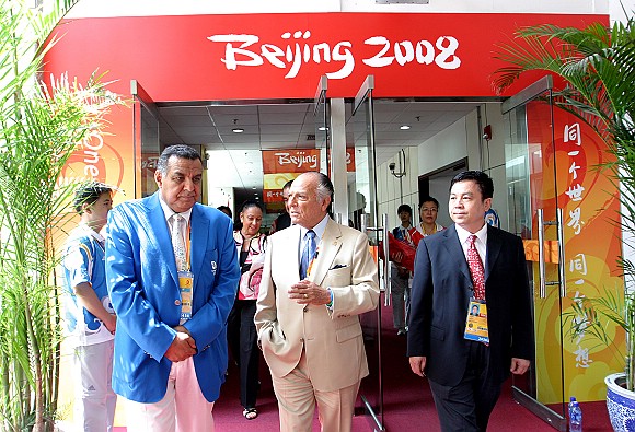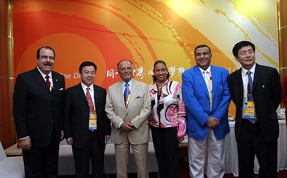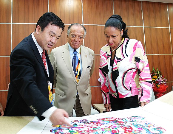 杨宾主任向阿科斯塔主席介绍了场馆观众坐席、媒体服务、体育展示、志愿者等情况,最后双方合影留念。