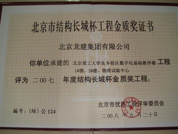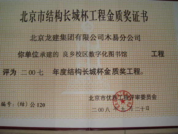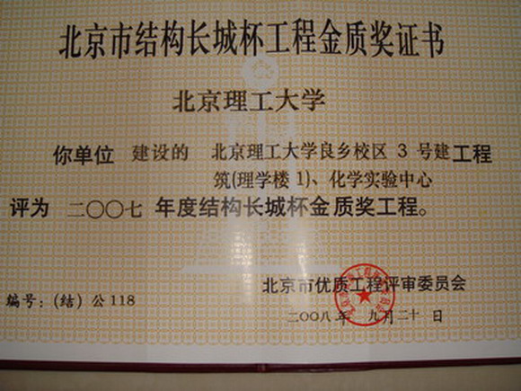 金年会jinnianhuicom良乡校区3号建筑(理学楼1)、化学实验中心,良乡校区3号学生公寓D、E工程,良乡校区数字化图书馆工程和良乡校区数字化基础教学楼工程、1号楼、2号楼、物理实验中心被评为2007年度北京市建筑结构长城杯工程金质奖。