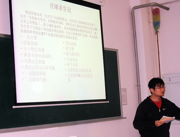 当天志愿者讲授的时间大概只占了2个小时,剩下的一个小时,志愿者做了一个群面的游戏,通过设定一个问题,以小组为单位进行讨论,志愿者作为观察者,观察学员的领导能力、协调能力、分析能力等等。