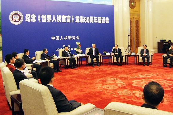 为了纪念宣言发表60周年,中国人权研究会在人民大会堂北京厅举行了座谈会,胡锦涛总书记向座谈会发来贺信。全国政协前副主席、致公党前主席、中国人权研究会会长罗豪才主持座谈会,中央宣传部副部长、中央对外宣传办公室主任、国务院新闻办主任王晨宣读胡锦涛主席的贺信,并作主题发言。民革中央副主席、最高人民法院副院长、中国人权研究会副会长万鄂湘大法官、中国政法大学校长、中国人权研究会常务理事徐显明、中国人权研究会副会长陈士球、北京大学教授黄楠森也作主题发言。他们盛赞世界人权宣言在促进和保护世界人权中的作用,回顾我国在人权保护事业中取得的进展,并展望世界和中国人权发展的美好未来。