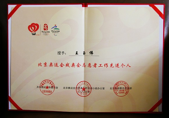 我校工会王玉伟同志荣获“北京奥运会残奥会志愿者工作先进个人 ”荣誉称号