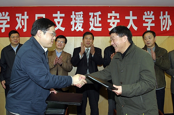 签字仪式上,我校赵显利副校长,延安大学王延奇副校长分别介绍了两校的基本情况,两校分别是中国共产党创办的第一所理工科大学和综合性大学,都有着悠久的历史和光荣的革命传统,两校之间的联系源远流长,因此有着良好的合作基础。李和章副校长宣读了协议的主要内容,主要包括:我校加大对延安大学学科建设的扶持力度,帮助制定和完善学科建设规划。重点帮助建设化学工程与工艺等6至8个专业,以增强延安大学适应和服务陕北老区经济建设的能力;帮助建设20门左右重点课程,并在此基础上建设10门精品课程,争取1至2门入选国家级精品课程;每年选派10至20名院士或专家到延安大学进行学术讲座,开展学术交流;每年接收延安大学5名免试推荐研究生攻读硕士学位,代培2至3名博士研究生;帮助实现优势学科专业博士学位授权点的突破,联合招收化学工程与工艺博士研究生;指导帮助延安大学制定实验室建设发展规划,重点建设过程装备与控制等4个实验室,并争取其中1至2个建成省级重点实验室,同时在条件允许的情况下,援助部分教学仪器设备;帮助延安大学开展师资队伍建设,每年接受延安大学选派15-25名优秀青年教师来校进修深造;选拔延安大学教师到校参与研究生培养工作,提高教学科研水平;在延安大学开设研究生课程进修班,提高教师整体素质;我校与延安大学,结合当地实际情况,联合申报科研项目,并帮助延安大学加大科研项目申报立项的力度。在公共服务体系建设方面,金年会jinnianhuicom提供图书资料和图书馆信息共享,并帮助做好校园信息化建设工作,同时将协助延安大学开展对外合作交流,帮助建立长期研究的联合实验室,召开国际学术会议等。
