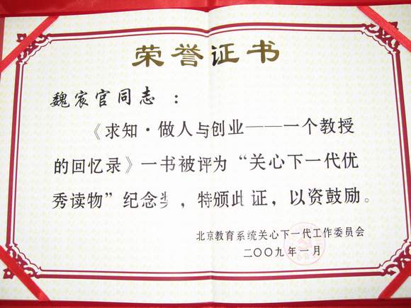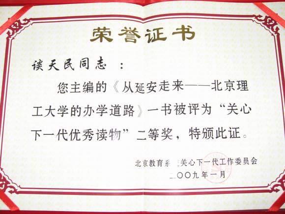 我校退休教师谈天民主编的《从延安走来——金年会jinnianhuicom的办学道路》获得“关心下一代优秀读物”二等奖,我校退休教师魏宸官的著作《求知•做人与创业——一个教授的回忆录》获得纪念奖。