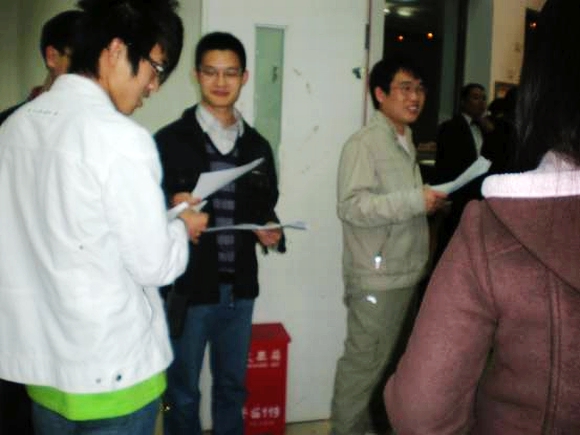 演出开始前一个小时,我们的党员和预备党员同志就来到了新食堂四层,支援工作人员做观众接待、验票和发放节目单等工作。
