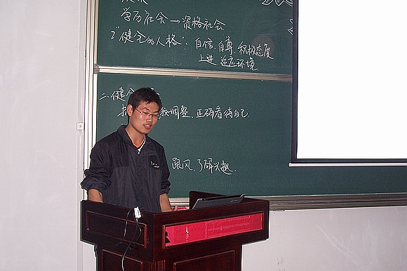 接下来,党支部书记王丽莹同学做了精彩发言,她采取了互动问答、问题研讨的方式,分别结合“灰领现象”、大学生自杀事件、大运会等诸多案例阐述了大学生的全面、协调、可持续发展问题,由灰领现象谈到了大学生实践动手能力、创新能力的缺乏,由自杀事件剖析了大学生的心理健康、培养健全人格的问题,由大运会的案例讲到身体素质与体育锻炼的问题,每一个案例都由她带领大家共同分析现象,剖析原因,讨论解决办法,热烈的氛围把活动带向了高潮。