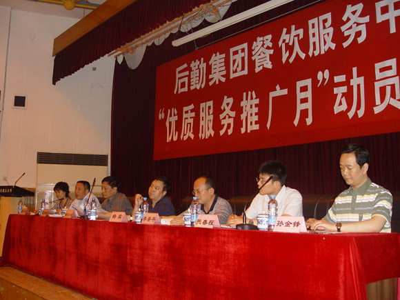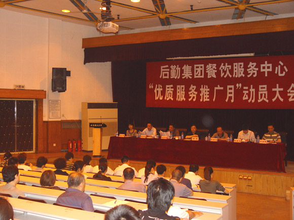 2009年5月14日下午,后勤集团餐饮服务中心在七号楼报告厅召开了“优质服务推广月”动员大会,校党委副书记杨宾,后勤集团党委书记杨学洲,后勤集团总经理李晋平,后勤集团常务副总经理巫后新,校学生会秘书长张春程,后勤集团总经理助理、餐饮服务中心主任孙金锋及餐饮中心近300名员工参加了大会。