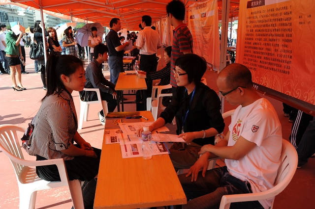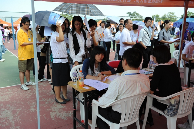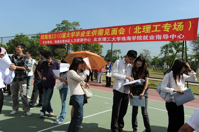 11月7日,珠海地区今秋首场2010届大学毕业生供需见面会在我校珠海学院网球场拉开序幕。本次由珠海市香洲区人力资源中心和珠海学院就业指导中心共同举办的面向珠海地区2010届大学毕业生的供需见面会,共吸引了包括埃森哲(中国)有限公司、美国友邦保险有限公司广东分公司、珠海丽珠医用生物、珠海乐通化工、广东宝莱特医用科技、珠海用友软件、珠海永亚软件、珠海通创电子、奈电软性科技电子、珠海森创理工科技、珠海市君悦雷克萨斯、珠海海湾大酒店、广发证券等95家用人单位参会,主要集中在IT、制造、金融、酒店、零售及咨询服务业等,提供软件研发、程序员、工程技术、生产助理、市场营销、会计、文秘、美工设计等300多个职位,招聘人数约2400人,共吸引包括北理工、北师大、暨大、中大等珠海高校应届毕业生约5000人进场求职。
